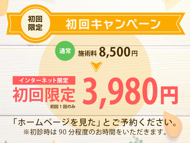 初回の方はカウンセリングや検査、説明等が必要になりますので、1時間半程度の時間確保をお願いしております。